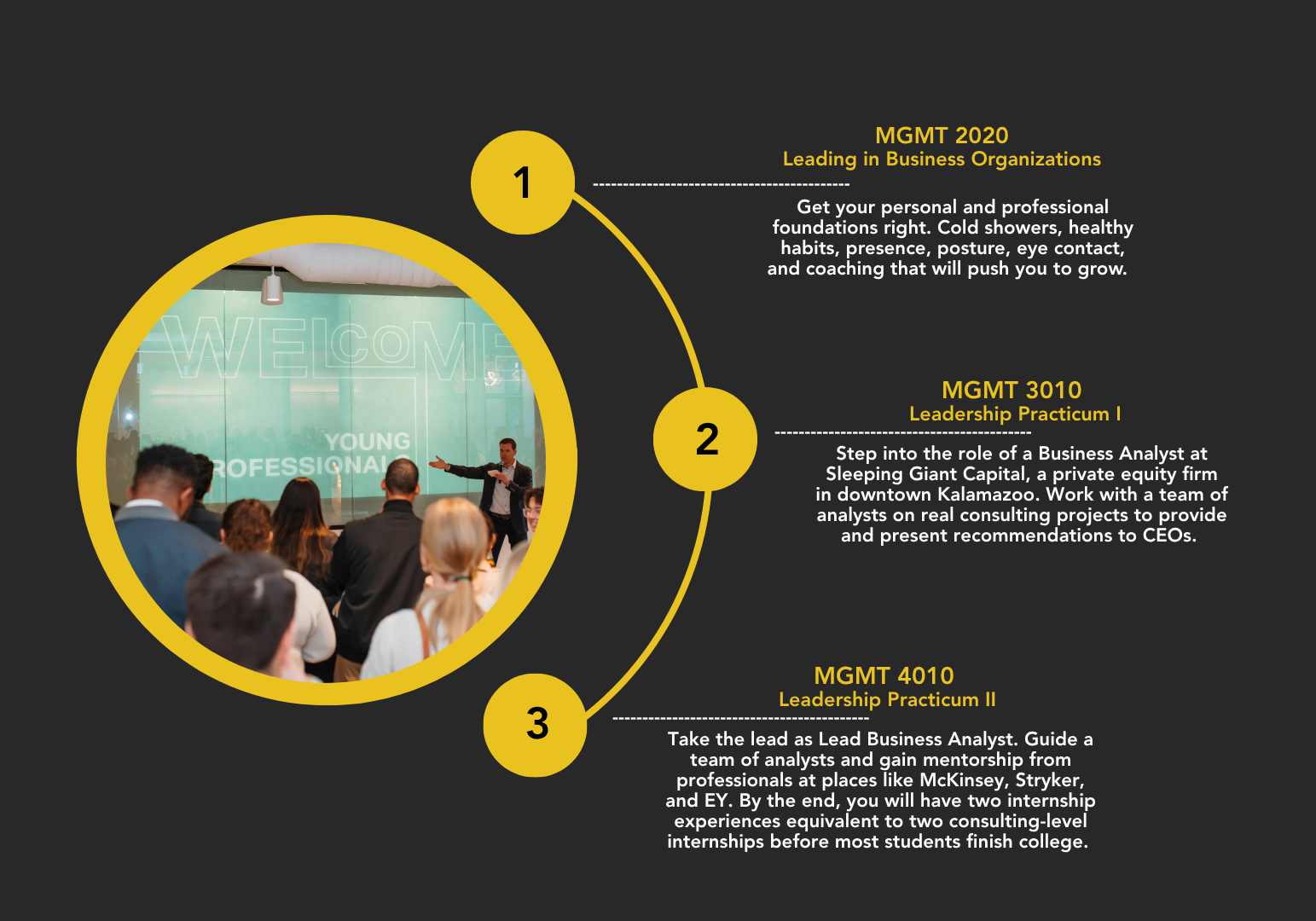 Work inside Sleeping Giant Capital, a place-based investment firm in downtown Kalamazoo, where students operate alongside investors, CEOs, and managing partners. Through this practicum, you won’t just observe business — you will lead teams, shape growth strategies, and contribute to real decisions that grow portfolio companies.